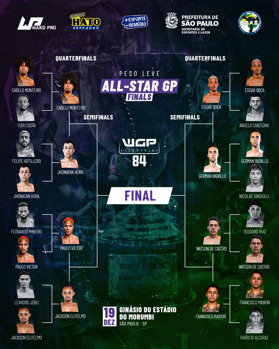O maior evento de luta em pé da América Latina está de volta a São Paulo para encerrar a temporada em grande estilo. No dia 19 de dezembro, o WGP 84 toma conta do ginásio do Estádio do Morumbi para decidir quem será o grande vencedor do All-Star GP dos Leves. O torneio começou na edição 82, em novembro, quando os 16 melhores atletas até 60kg entraram no ringue para disputar as oitavas de final. Agora, depois de uma primeira fase intensa, voltam ao ringue os oito guerreiros que carimbaram a vaga: Cabelo Monteiro, Jhonatan Hora, Paulo Victor, Jackson Elitelmo, Edgar Boca, German Badallo, Francisco Mairon e Watson de Castro. Eles vão se enfrentar em uma noite única que reúne quartas, semifinais e a grande decisão, valendo o troféu do GP e a chance de disputar o cinturão da categoria, exceto, claro, em caso de vitória do campeão Cabelo Monteiro. O evento tem ainda o duelo entre Ravy Brunow e Mateus Machado, pela divisão dos Meio-Médios, como destaque. A transmissão ao vivo do card principal fica por conta do Canal Combate a partir das 21h00.